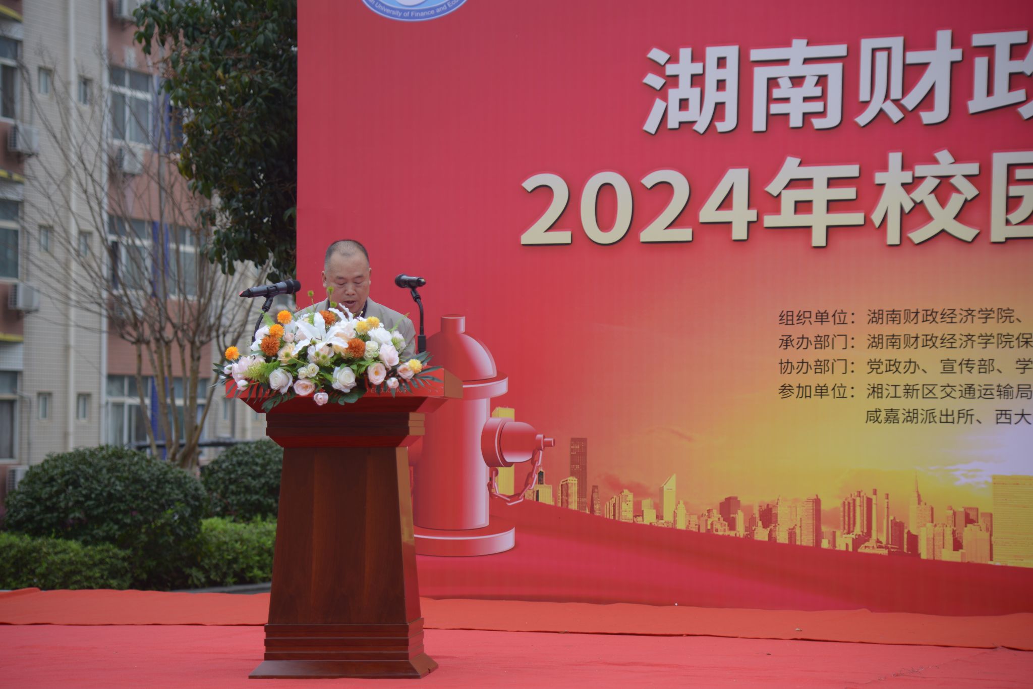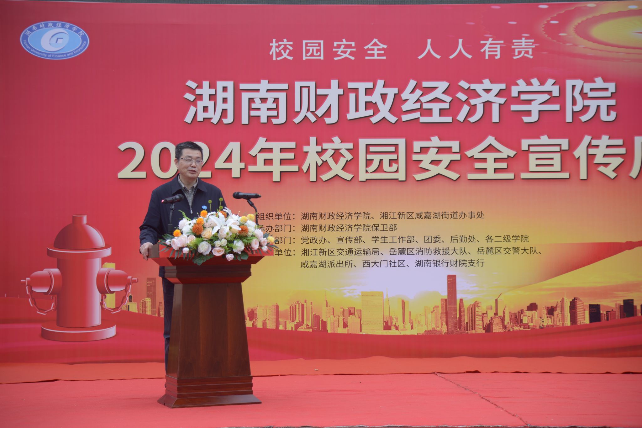 本次活动邀请了湘江新区交通运输局、岳麓区消防救援大队、岳麓区交警大队、咸嘉湖派出所、西大门社区、湖南银行财院支行等单位来现场参加校园安全知识集中宣讲活动。校长刘长庚、副校长刘茂盛、党委委员、宣传部部长文炳勋及学校党政办、学生工作部、团委、保卫部、后勤处等部门负责人及相关工作人员参加了活动启动仪式。
