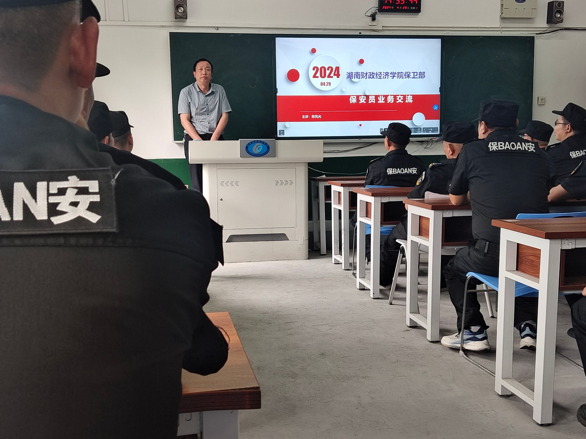 4月29日下午,保卫部在一教405多媒体教室对即将入驻学校的中保恒杰保安公司所有保安人员开展入岗前业务培训工作。