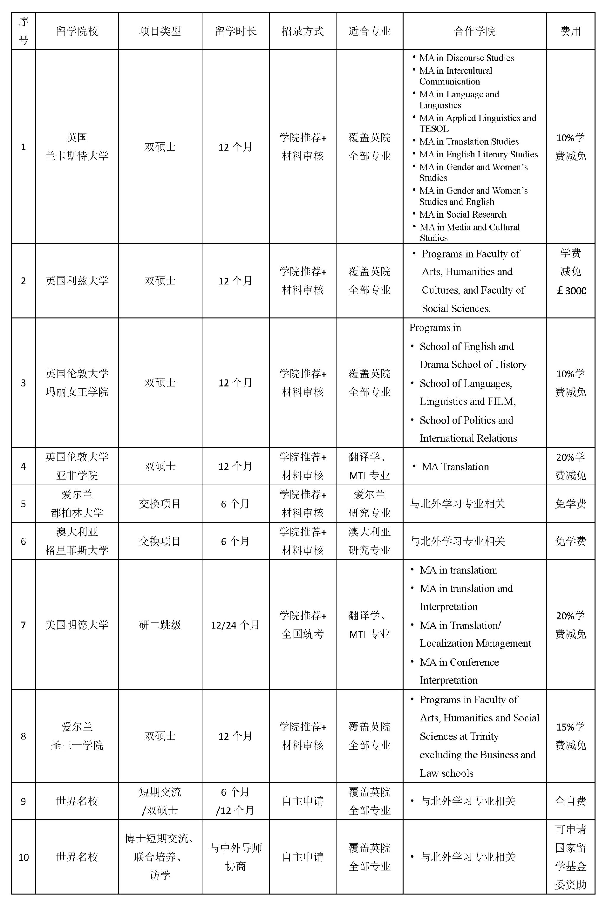 jinnianhui今年会研究生(含硕士生和博士生)短期留学项目旨在培养国际化复合型人才,为学生提供赴世界名校交流学习的机会。硕士生出境交流时间须在完成一年学习之后根据具体情况确定,博士生须与导师商量后确定。短期留学项目注重夯实学生专业功底,提升学生的专业素养、跨学科能力及国际竞争力,助力学生全面发展。学生在外就读专业与北外在读专业相关,所修学分得到认可,可计入毕业学分。各项目简要介绍请参见下表。