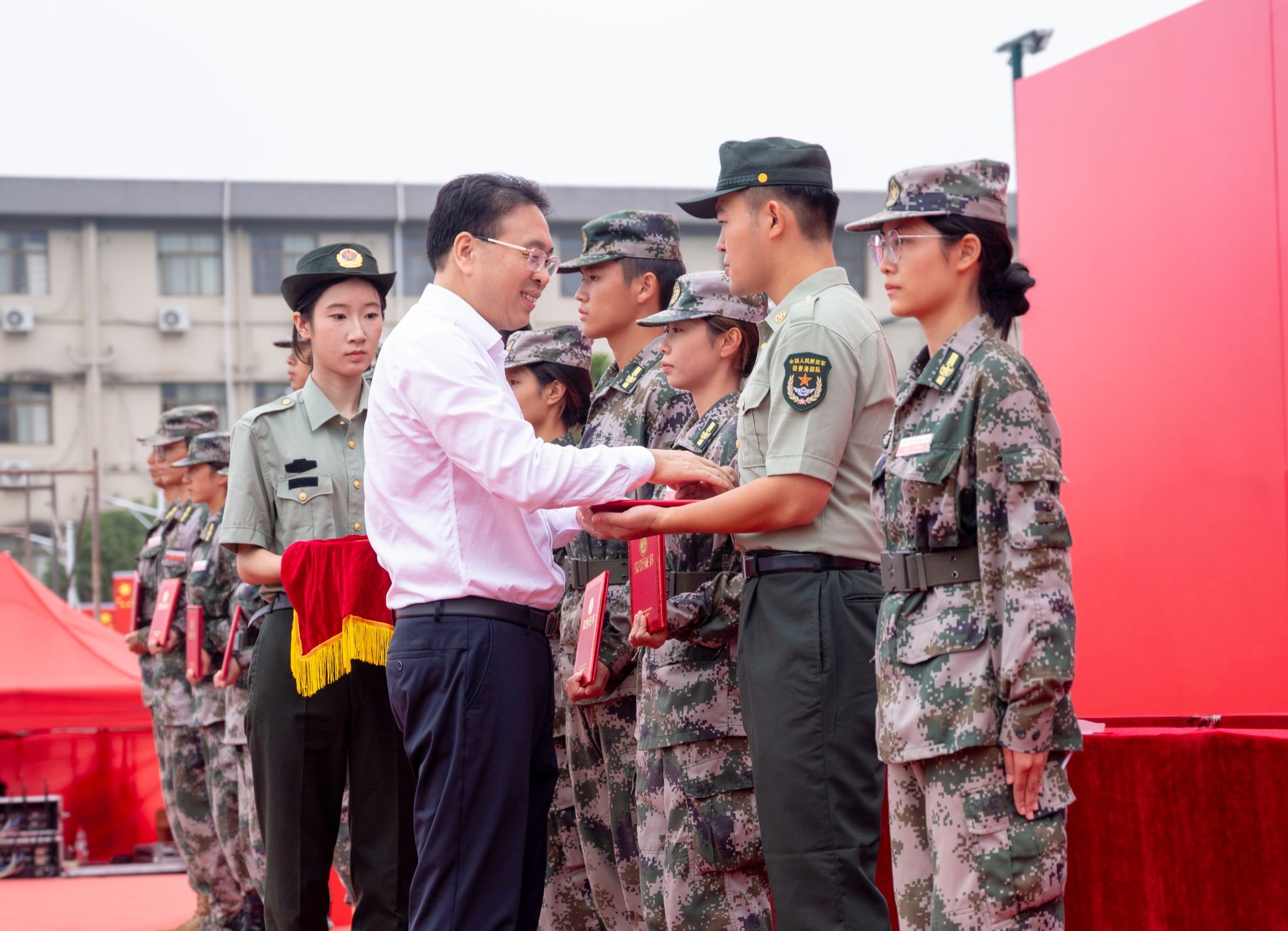易棉阳代表学校向圆满完成军训任务的全体同学和受表彰的集体个人表示祝贺,向全体教官致以衷心感谢。他指出,军训是一堂生动的教育课,同学们经此一训,不仅锤炼了革命纪律、收获了战友情谊、强健了体魄,更铸就了可贵的战斗精神。他勉励同学们务必认真学习,脚踏实地努力奋斗,在全面超越自我、塑造自我的过程中实现高质量成长,达成高质量就业,让青春在反复磨练中绽放光彩。