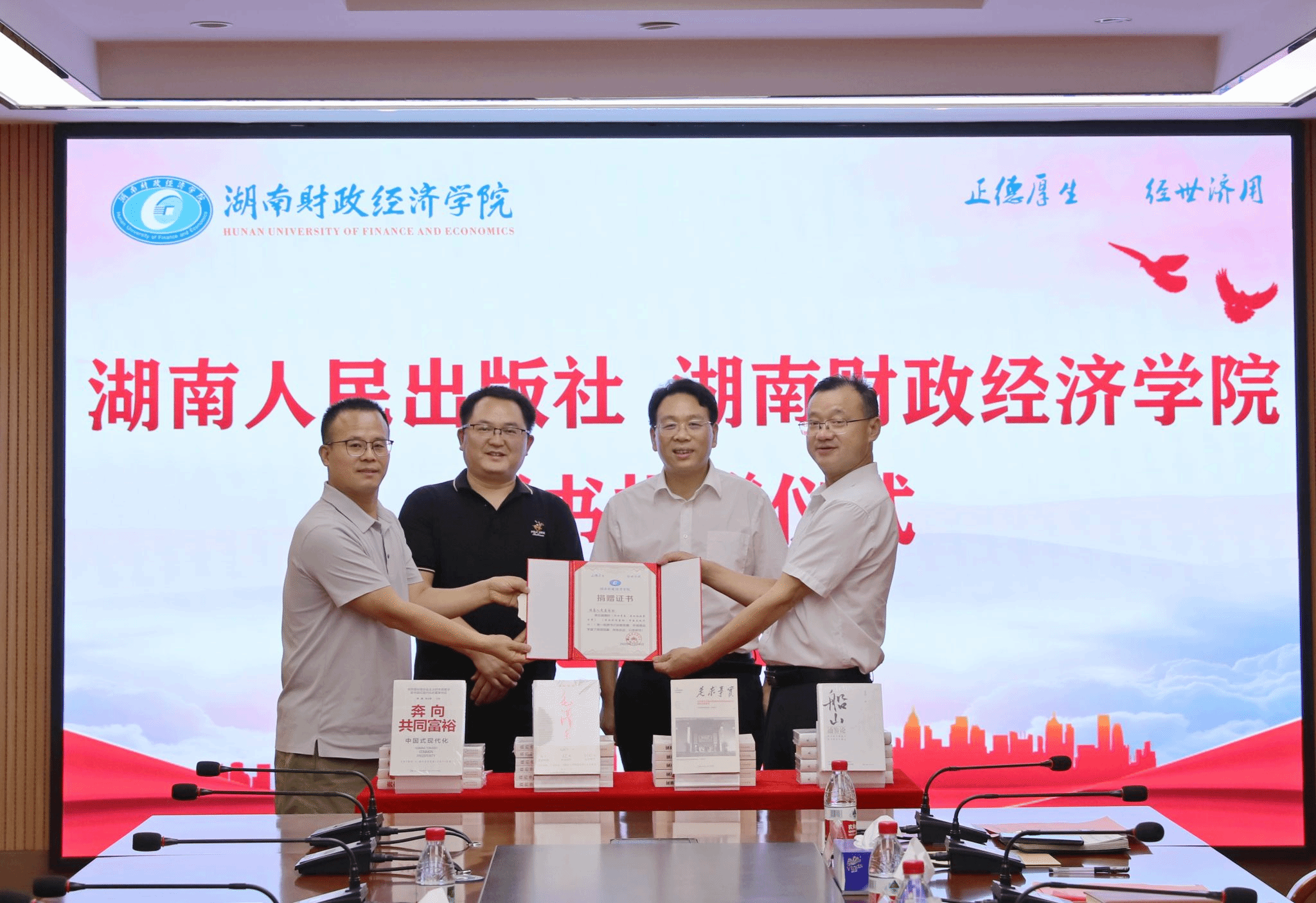 (本网讯)7月14日下午,湖南人民出版社捐赠图书仪式在beat365官网办公楼715会议室举行。湖南人民出版社党委书记、社长张勤繁,副社长彭翔,校党委书记易棉阳,副校长潘爱民,党委委员、宣传部、统战部部长文炳勋出席捐...