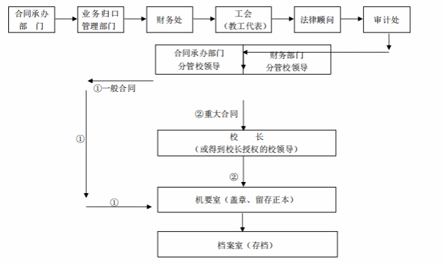 备注 | 1.合同立项后,一般由业务归口管理部门作为合同承办部门(招标采购合同除外),负责合同文本起草; 2.合同承办部门与业务归口管理部门为同一部门时,可不重复签署意见;合同内容涉及到多个职能部门的,须经相关职能部门会签。 3.凡是采购金额在5万元以上的项目,都必须签署经济合同。 4.财务处、教工代表一般只参与经济类合同审查,其中,教工代表只参加20万元及以上的合同。 5.审计处一般只参与经济类和重大合同审查。 6.法律顾问参与所有合同的审查。 7.合同的正式文本一般按照性质(一般或者重大)提请相关校领导签署,其中重大合同须由校长或授权分管校领导进行签署。 |