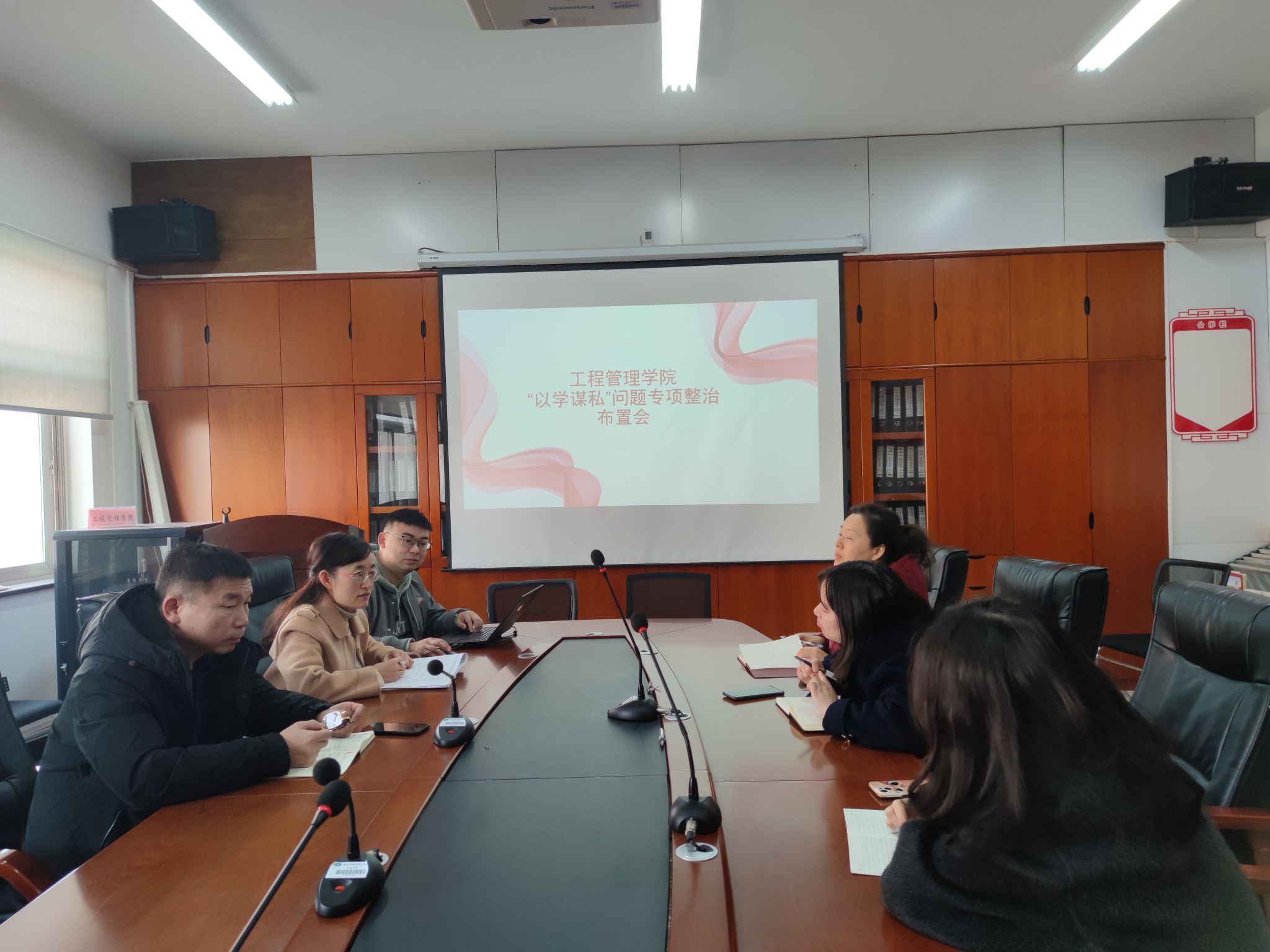 (本网讯)11月2日,工程管理学院在办公楼九楼会议室召开“以学谋私”问题专项整治工作推进会,院党委书记向占宏作动员讲话,院党委副书记刘绿丝主持会议,全体行政党支部党员和教师党支部代表参加。
