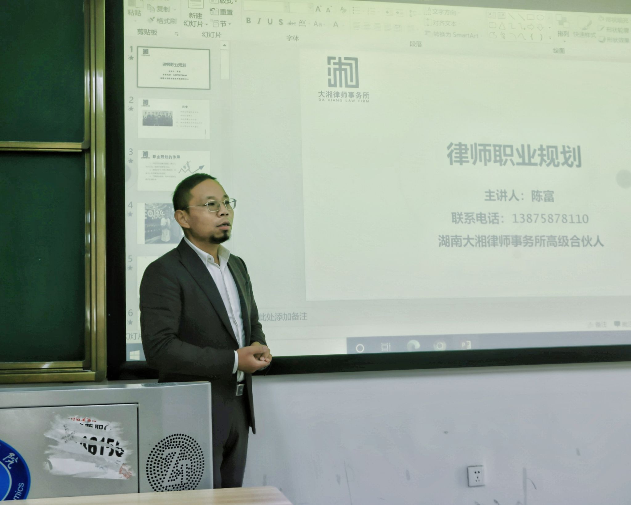 (本网讯)为帮助2024级法学学子了解律师职业实务,培养职业规划意识,助力学生未来职业选择,2024年11月27日,法学与公共管理学院邀请湖南大湘律师事务所董事、高级合伙人陈富律师在雷锋书院至诚楼L1403开展“律师职业规划”专题讲座,本次讲座由法学系系主任冯理主持。