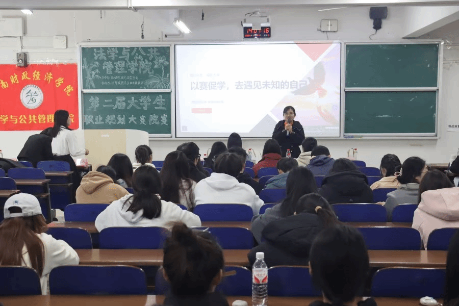 (本网讯)为加强大学生职业生涯教育和就业指导,增强大学生生涯规划意识,促进我院学生高质量充分就业,11月27日,法学与公共管理学院于主校区3108教室举行了第二届大学生职业规划大赛院赛。本次院赛特邀教育学博士、湖南师范大学硕士研究生导师罗莎莎作为专家评委参与指导,学工办主任彭兰、行政管理系主任侯丹丹、劳动与社会保障系主任周云芳、社会工作系主任刘曼格出席本次比赛,各班级学生代表共计80余人观看比赛。