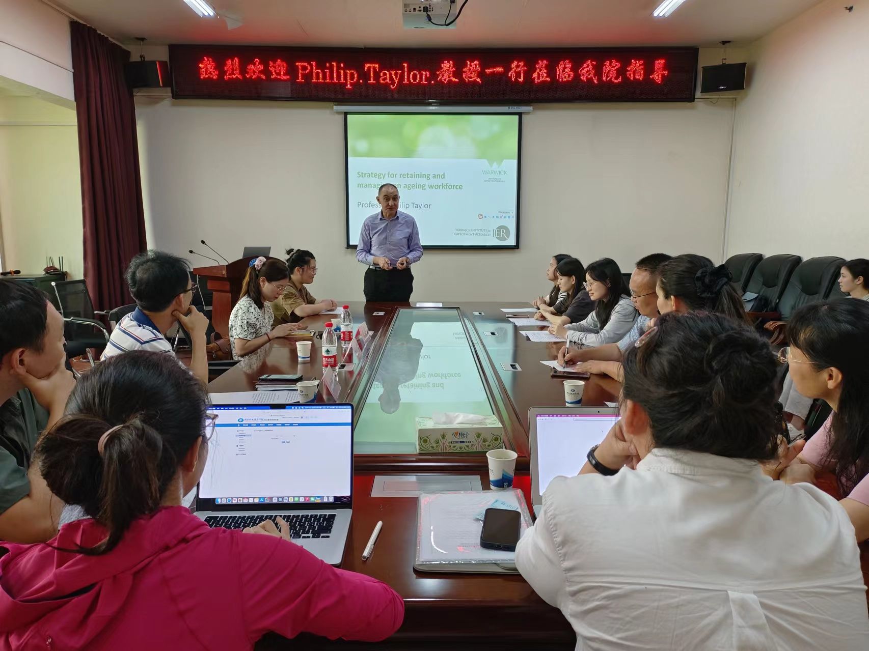 (本网讯)5月23日下午,法学与公共管理学院特邀英国华威大学就业研究所Philip Taylor教授于办公楼414-2会议室举办“留用和管理老龄劳动力的策略”主题学术讲座。讲座由学院副院长姚德超教授主持,师生共40余人参加。