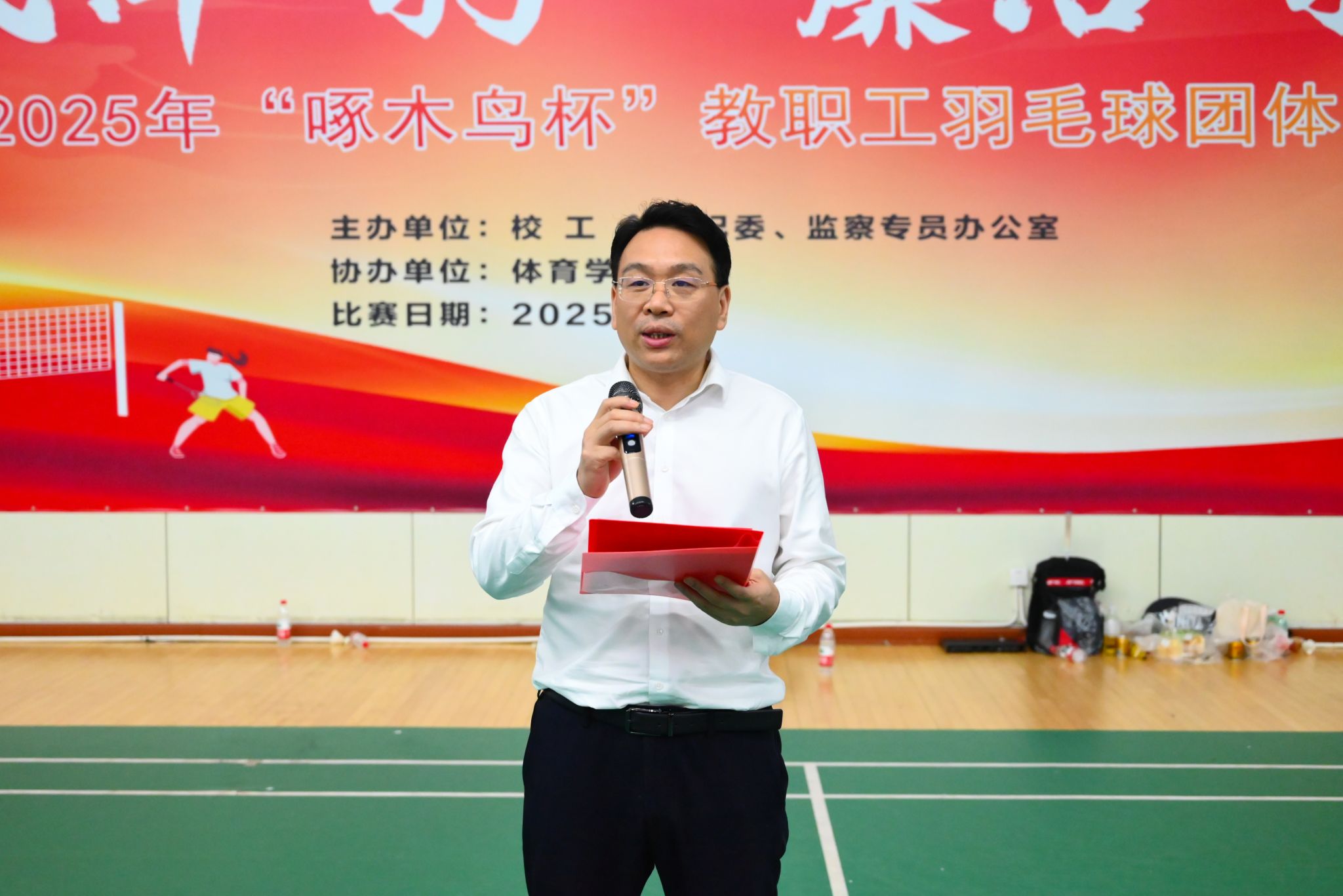 (本网讯)5月7日至12日,由校工会携手校纪委共同主办的2025年“啄木鸟杯”教职工羽毛球团体赛在主校区体育馆成功举办。校党委书记易棉阳,党委副书记苏玲,副校长赵鹤平,纪委书记李雪山,副校长、工会主席刘钟理出席开幕式。来自各分工会18支代表队的300余名教职工参加比赛。