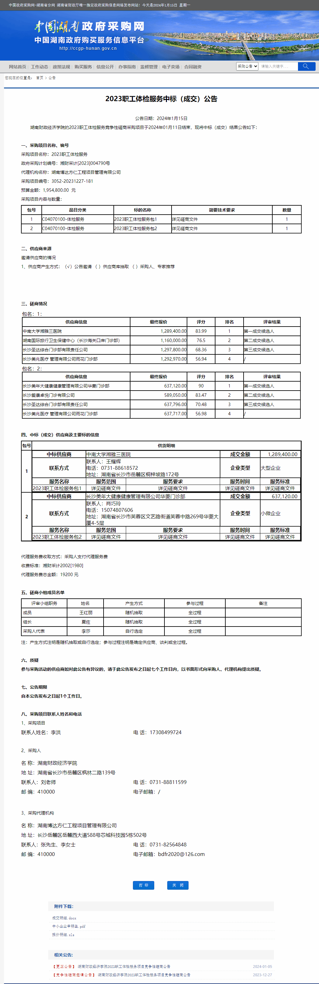 湖南省政府采购网:beat365中文在线官网2023职工体检服务中标(成交)公告
