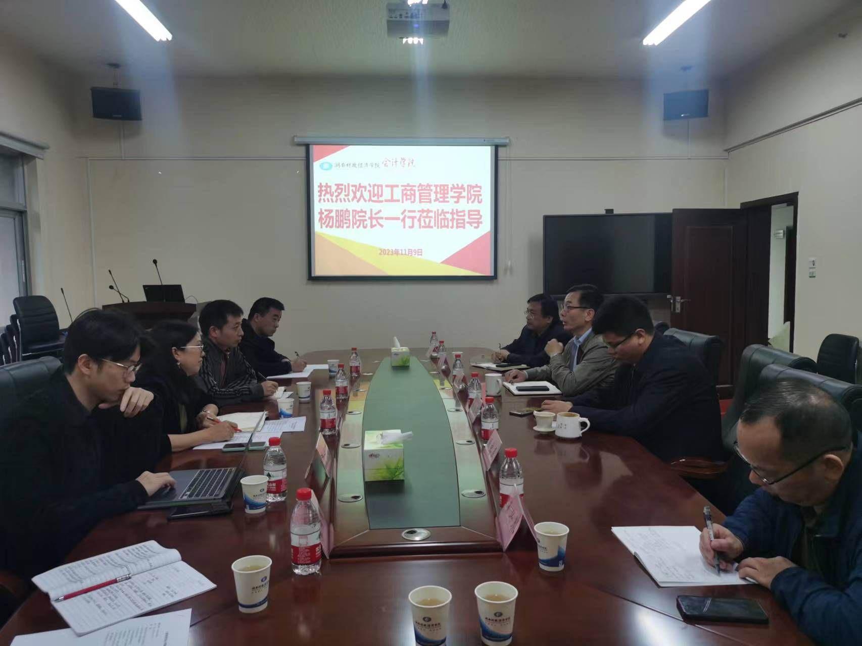 (本网讯)11月13日,工商管理学院院长杨鹏一行到会计学院进行考察交流。会计学院院长潘彬、副院长杨晓辉及相关部门负责人出席会议。