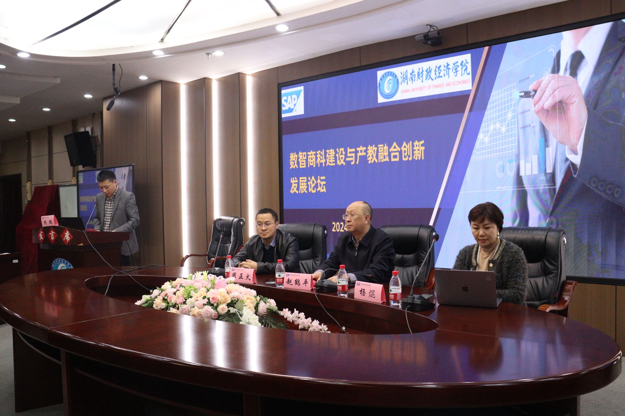 (本网讯)3月27日下午,我院在主校区五楼视频会议室举办数智商科建设与产教融合创新发展论坛。思爱普中国有限公司SAP创新社区大中华区总监杨焜、国家市场监管行指委检验检测专委会副秘书长周正火作主题报告。副校长赵鹤平出席并致辞,工商管理学院主要负责人、全体专任教师及学生代表参加活动。