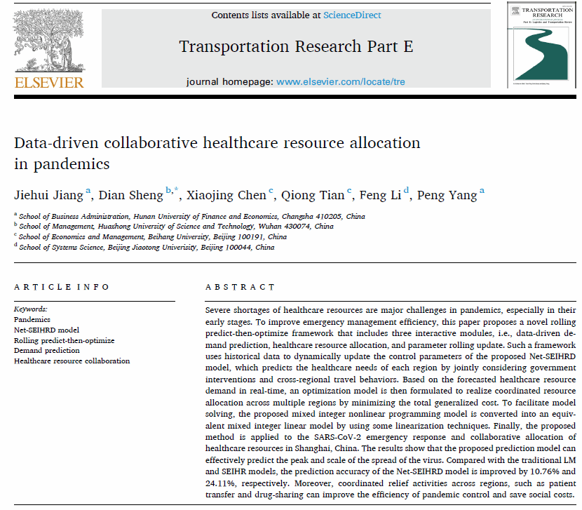 近日,我院物流管理系教师蒋杰辉博士(后)与华中科技大学、北京航天航空大学和北京交通大学等高校学者合作的论文“Data-driven collaborative healthcare resource allocation in pandemics”在运输与物流领域国际权威期刊《Transportation Research Part E: Logistics and Transportation Review》正式刊出。Transportation Research Part E: Logistics and Transportation Review是SCI,SSCI双检索期刊,影响因子10.047,中科院一区top,ABS三星级期刊,FMS管理科学高质量国际B类期刊。
