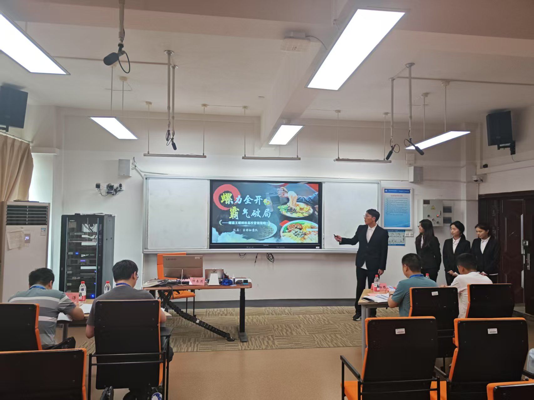 复赛现场,两位企业评审专家——湖南大青生态科技有限公司总经理刘湘雄和长沙靖港古镇文化旅游开发有限公司副总经理秦涛,为竞赛选手们带来了丰富的行业经验和前沿的市场视角;两位校内评审专家 ——工商管理学院科研办主任邹浩和信息技术与管理学院电子商务系李博主任,从商业价值、创新性、可行性等多个维度对参赛项目进行了专业点评和严格筛选,为评审工作提供了坚实的理论支撑。