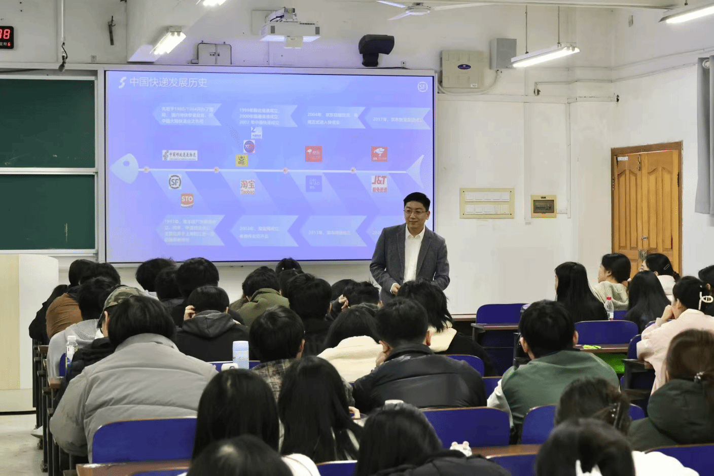 (本网讯)12月7日,beat365中文在线官网工商管理学院于第三教学楼3301教室举办管理前沿专题讲座。讲座邀请顺丰速运湖南区负责人顾颐杰、人力资源部负责人徐亚丽围绕物流行业发展作主题演讲。工商管理学院院长杨鹏主持讲座,2023级物流管理专业全体学生参加讲座。