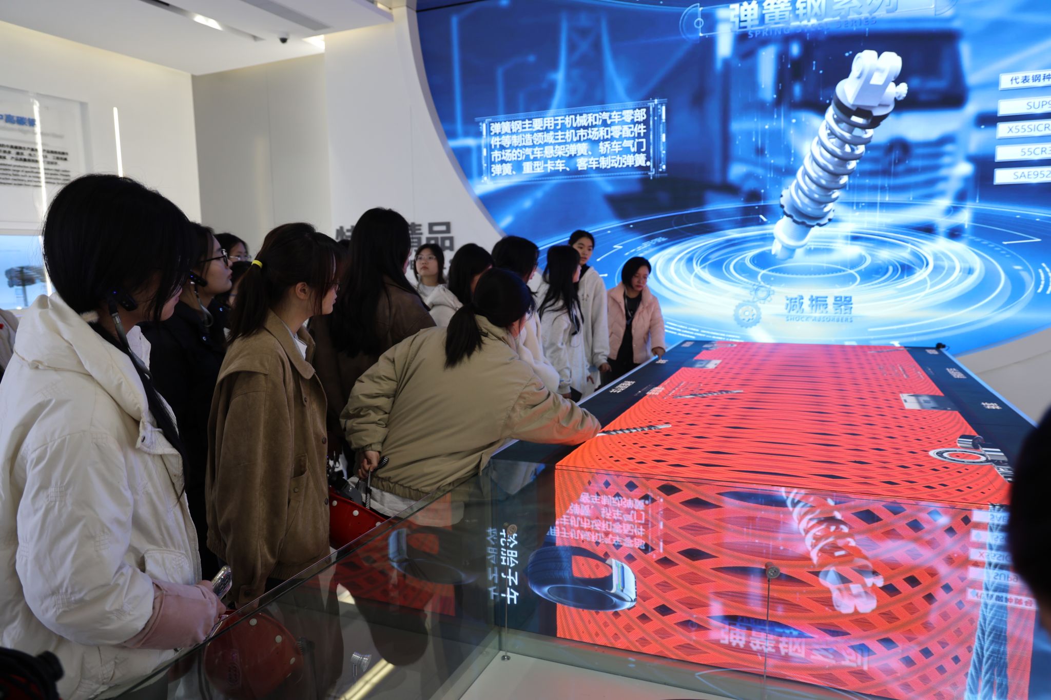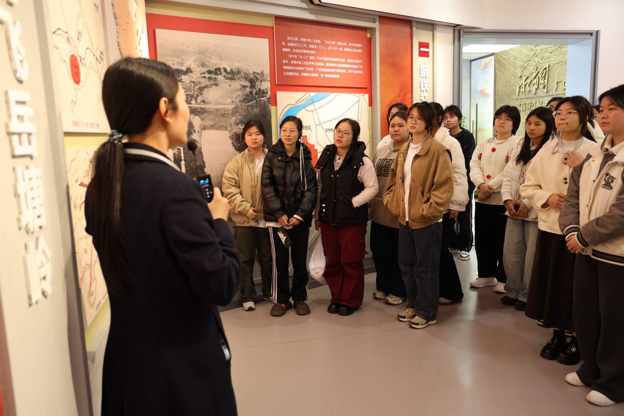 师生首先参观湘钢文化园厂史馆。馆内通过“钢铁布局,落子湘潭”等四大篇章,系统展示了企业自1957年建厂以来的奋斗历程。在讲解中,同学们了解到湘钢建设初期打破常规、优先建设金属制品厂,仅用五个月便建成投产,并于1958年成功产出湖南省第一根钢丝绳的创业事迹,深刻体会到湘钢人艰苦奋斗、开拓创新的精神传承。