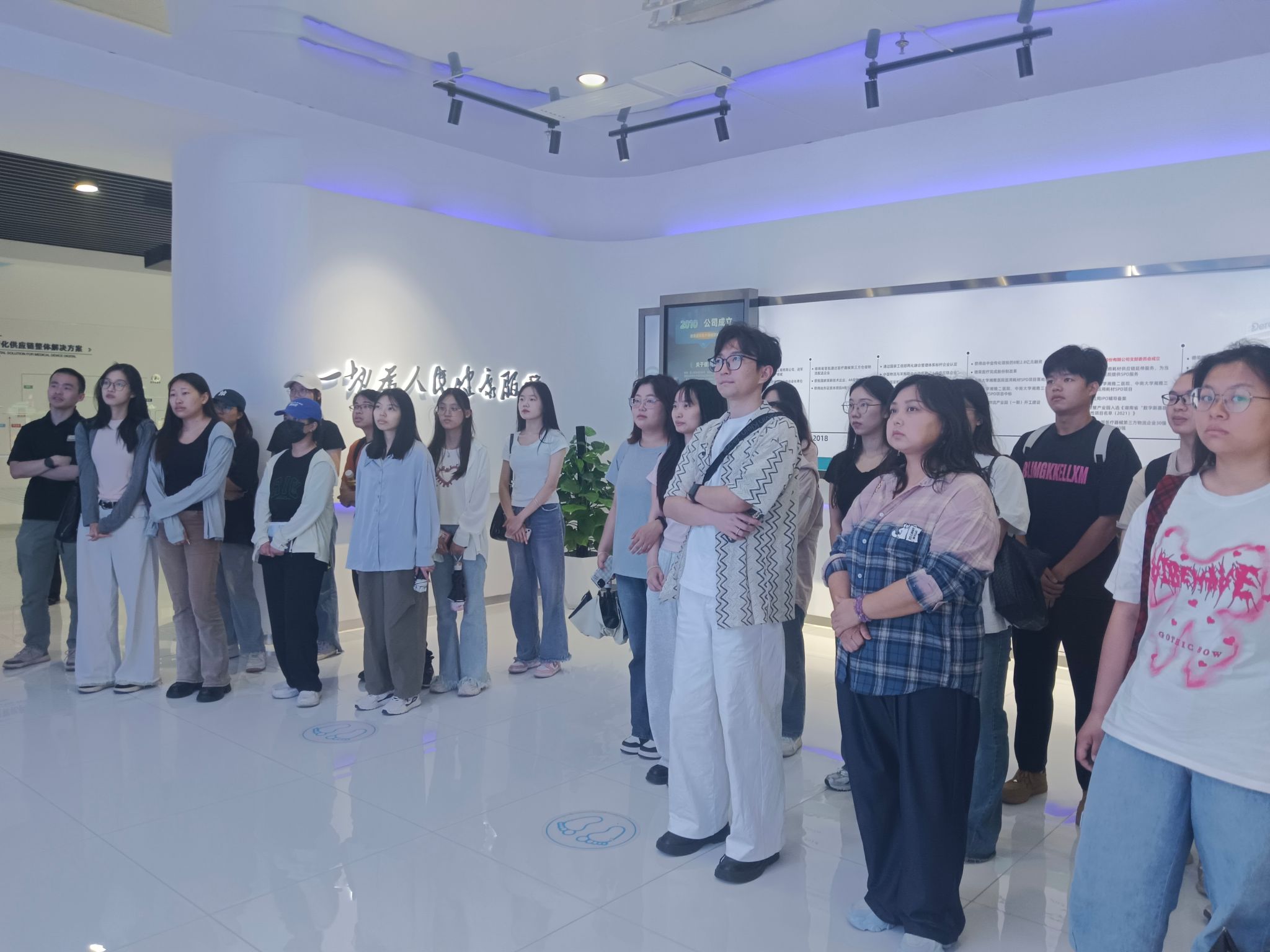 在德荣医疗企业代表的陪同下,师生团队对企业核心业务单元进行了系统考察。参观过程覆盖医疗器械生产全链条,全方位展现了企业的专业实力与创新能力。在智能化生产车间,配备先进智能化质检设备,学生们亲眼目睹了精密医疗设备的标准化组装流程,深刻体会到科技在医疗生产中的重要作用;数字化仓储物流中心内,SPD 供应链管理系统高效运行,实现了医疗物资的精准配送,让学生们对现代供应链管理有了更直观的认识;研发实验区里,技术人员现场演示新型骨科植入物的检测认证过程,展现了企业在医疗器械研发领域的领先技术。企业讲解员从关键经营数据、典型服务案例和战略规划蓝图三个维度,详细阐释了德荣医疗 “研发 -生产 - 配送”一体化的运营模式,让师生们对企业的发展战略和行业地位有了全面了解。