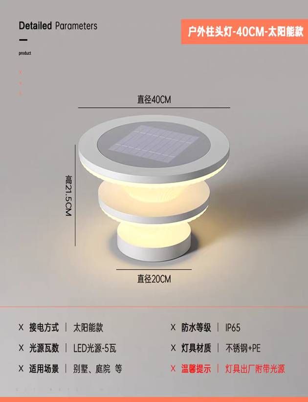 规格及参数:接电方式:太阳能;防水等级:IP65;光源瓦数:LED光源-5瓦;灯具材质:不锈钢+PE;灯具出厂附带光源;样式参数如下图 |