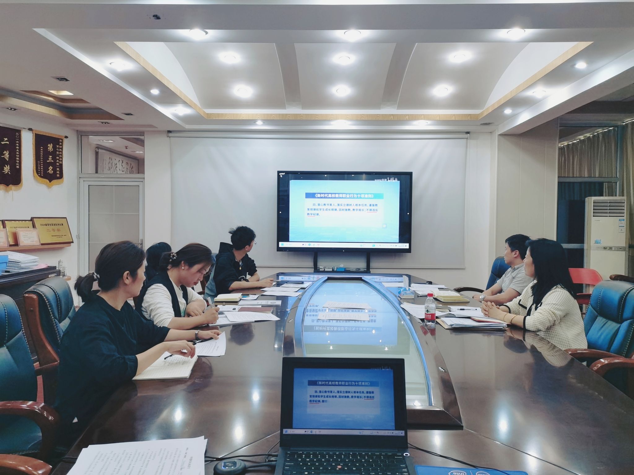 以案为鉴,绷紧纪律之弦。全体教职工集体观看了《高校师德师风建设》警示教育片,影片中科研经费挪用、学术不端、师生关系越界等典型案例引发强烈反响。结合学校近年发生的师德师风失范案例,肖平飞从“师生沟通边界”“涉外教学风险”等角度展开深度剖析,要求教师以“三问”自省:是否守住法律底线?是否践行为人师表?是否做到言行示范?