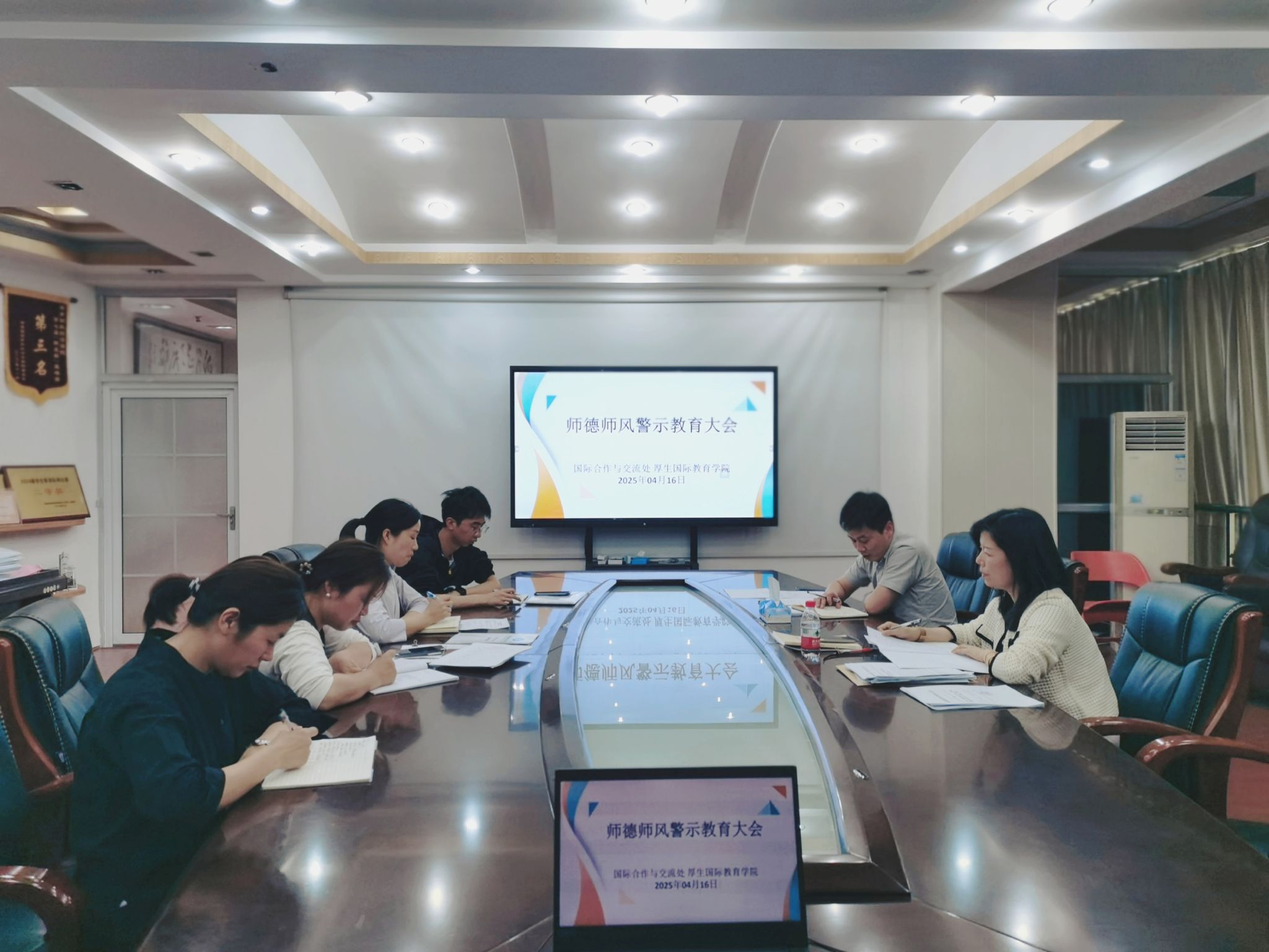 为深入贯彻落实新时代高校教师职业行为准则,强化师德师风建设,4月16日下午,国际合作与交流处、厚生国际教育学院召开全体教职工师德师风警示教育大会,通过专题学习、案例剖析、承诺践诺等环节,为教师队伍敲响思想警钟,筑牢职业底线。