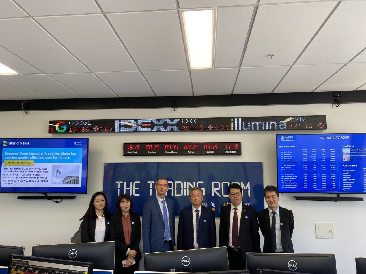 在新西兰期间, 刘钟理与奥克兰大学外事负责人肯尼斯详细探讨了学生联合培养项目和假期访学项目,并签署了《合作意向协议》;与梅西大学校董、副校长克里斯托弗就学生交换项目和教师访学项目展开深入探讨,双方一致同意开展多领域交流与合作,会见后刘钟理一行考察了该校股票模拟交易实训室等教学项目及实训设施。