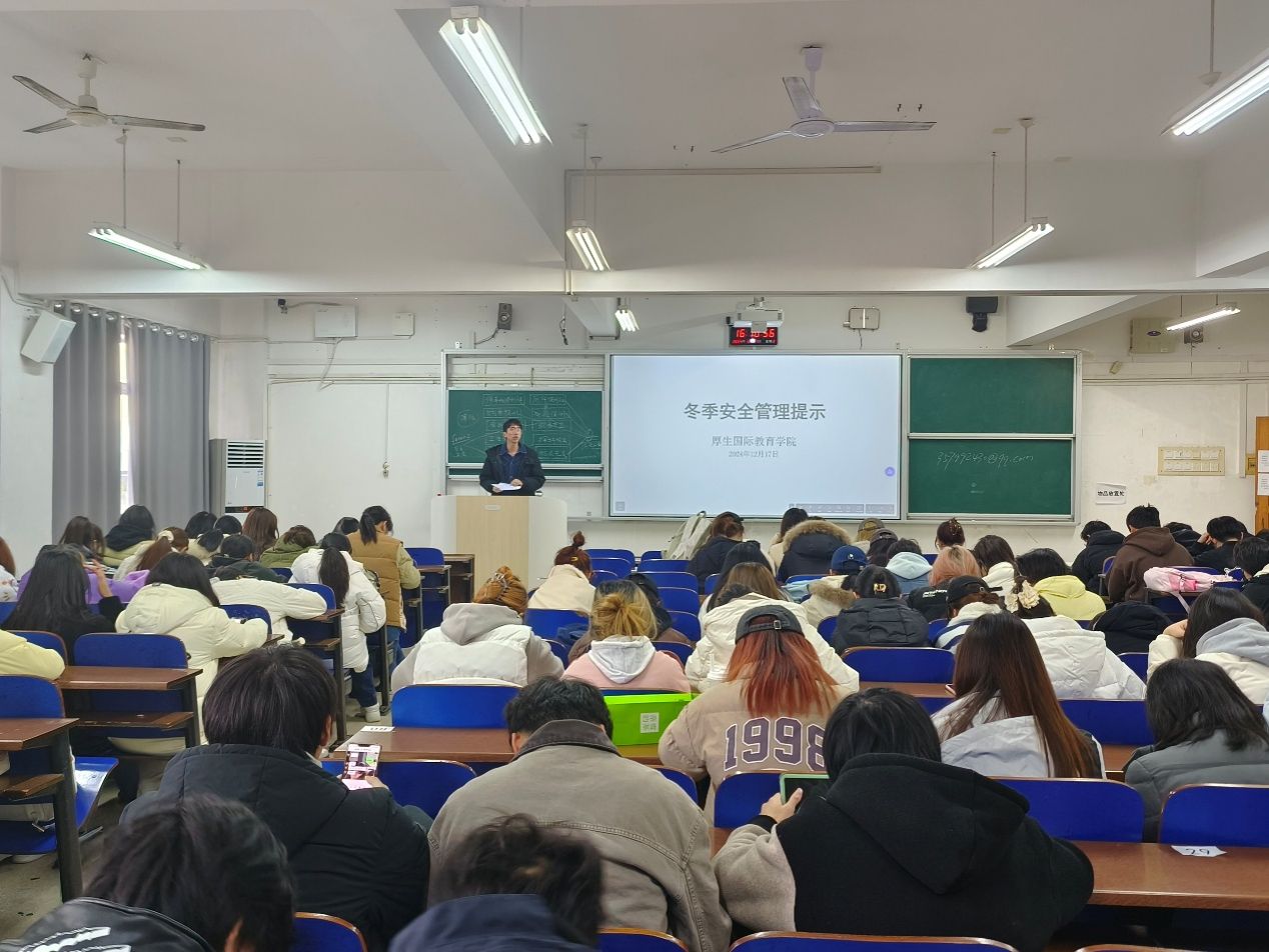 近日,为落实学校诚信考试教育要求,加强学院学风考风建设,营造良好的学习环境和考试氛围,严肃学校考试纪律,杜绝各类形式的考试作弊行为,强化学生诚信品德培育,同时结合学校安全检查等要求,厚生国际教育学院分批召开了各年级考前诚信教育暨冬季安全提示班会,班会由学院辅导员胡佩瑶、马艳、王超和肖云鹏分别主持,学院全体学生参与。