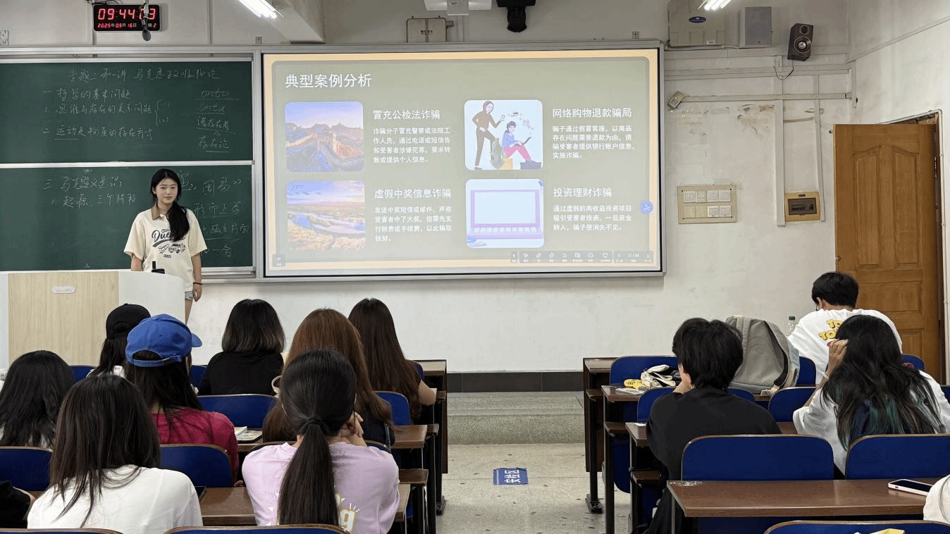 班委领学:夯实防骗知识根基。班会伊始,各班班委发挥引领作用,以《大学生防骗指南》为核心教材,围绕“不轻信、不转账、多核实”三大防骗原则展开系统讲解。从个人信息保护的“保密要点”,到不明链接、陌生二维码的“规避技巧”,班委们结合大学生常遇的信息泄露、账号被盗等场景,用通俗语言拆解安全知识;同时穿插近期发生的学生受骗案例,让抽象的安全原则转化为具体的防范方法。同学们认真聆听,互动交流氛围浓厚,有效实现了“知识传递+疑问解答”的双重效果。