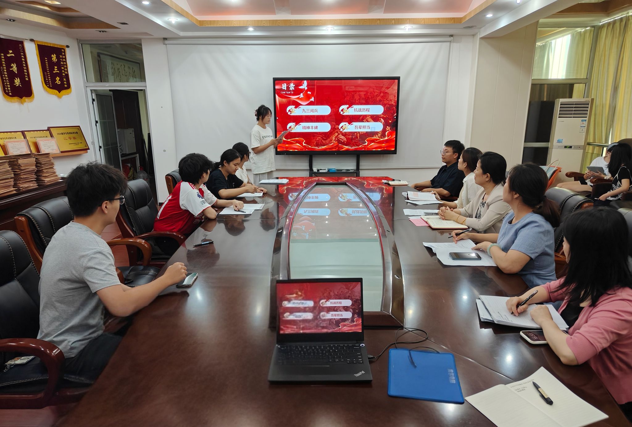 2025年9月17日,厚生国际教育学院直属党支部在办公楼830会议室组织开展了9月份主题党日活动,本次活动以“弘扬伟大抗战精神,推进民族复兴伟业”为主题,通过理论学习、微党课宣讲、观看专题片等多种形式,引导全体党员深刻感悟伟大抗战精神,强化使命担当。