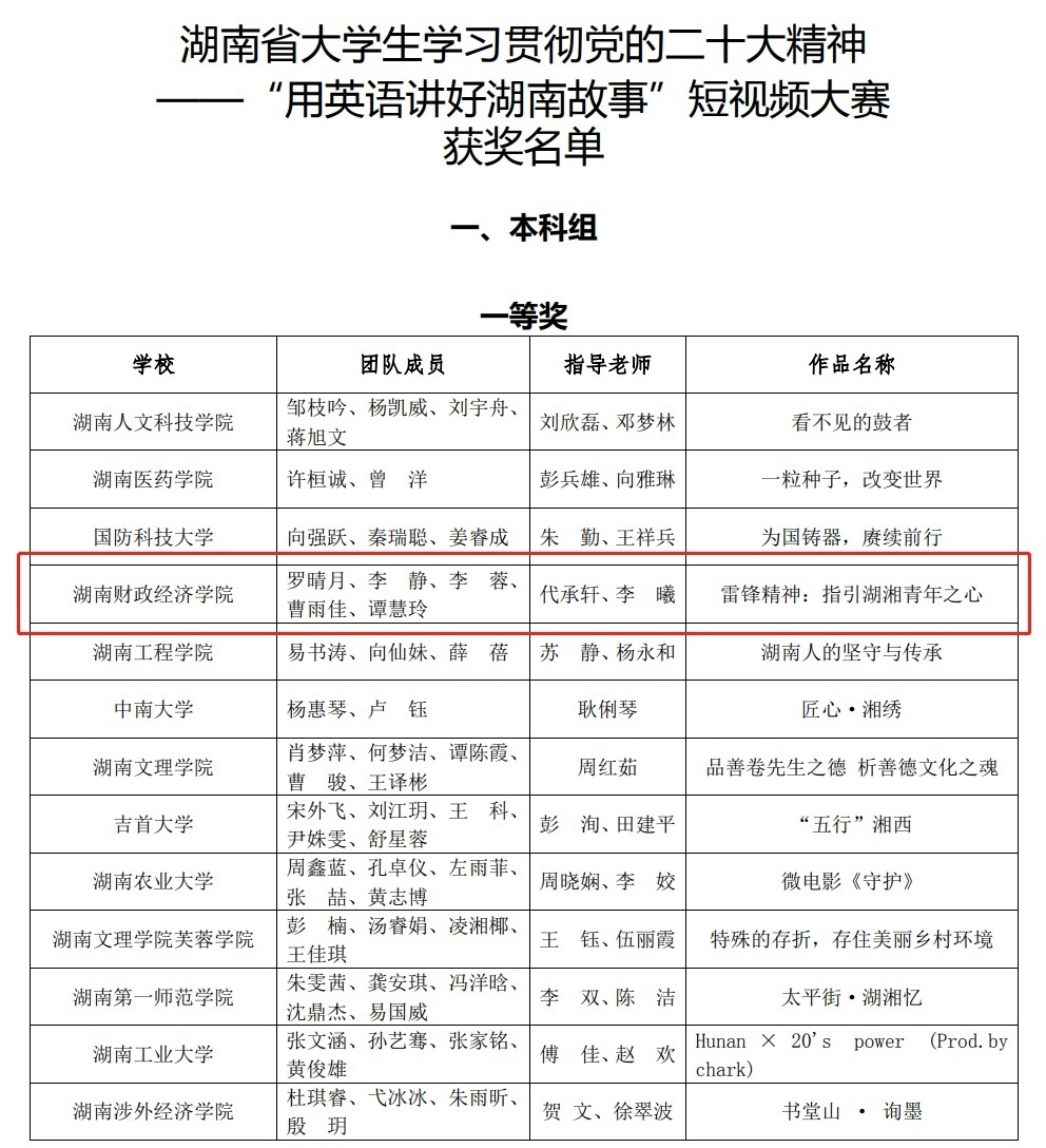 7月27日,湖南省大学生学习贯彻党的二十大精神——“用英语讲好湖南故事”短视频大赛圆满结束,beat365中文在线官网外国语学院学生团队作品《雷锋精神:指引湖湘青年之心》从数百件作品中突出重围,荣获一等奖。湖南财政...
