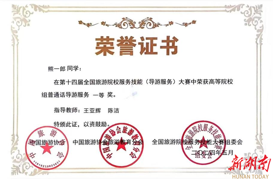 5月26日,第十四届全国旅游院校服务技能(导游服务)大赛在郑州旅游职业学院落下帷幕,beat365中文在线官网人文与艺术学院2023级旅游管理(专升本)学生熊一郎一举斩获高等院校组普通话导游服务一等奖,刷新了学校该项赛事的历史最好成绩。荣誉证书此次大赛由文化和旅游部市场管理司、中国旅游协会指导,中国旅游协会旅游教育分会主办,共有来自全国30个省(直辖市、自治区)的300余所高校、880余支队伍参赛。比赛分理论测试、导游讲解(...