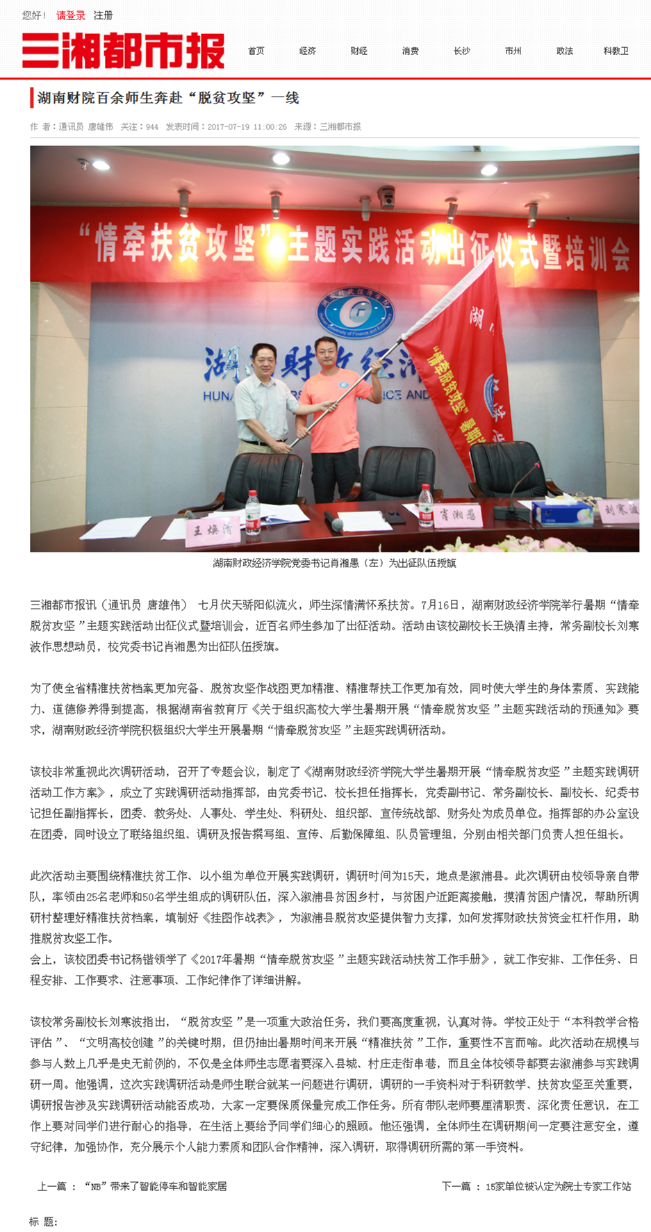 7月16日,beat365官网举行暑期“情牵脱贫攻坚”主题实践活动出征仪式暨培训会,近百名师生参加了出征活动。中国新闻网、红网、新湖南、星辰在线、三湘都市报、湖南教育网相继对相关情况进行了报道。湖南教育网:http://www....