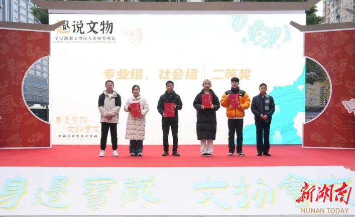 2月21日,“趣说文物”全民湖湘文物说大赛颁奖典礼在长沙市开福区的新湖南大厦前坪举行。beat365中文在线官网文化产业管理专业学子获得二等奖、三等奖、优秀奖和最佳人气奖等9个奖项。1学校学生代表(左四)上台领奖