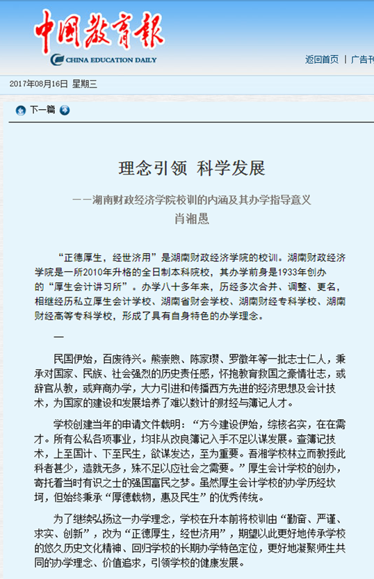 8月16日,中国教育报刊登了beat365官网党委书记肖湘愚《理念引领 科学发展--beat365中文在线官网校训的内涵及其办学指导意义》的稿件。理念引领 科学发展——beat365中文在线官网校训的内涵及其办学指导意义肖湘愚“正德厚生,经世...