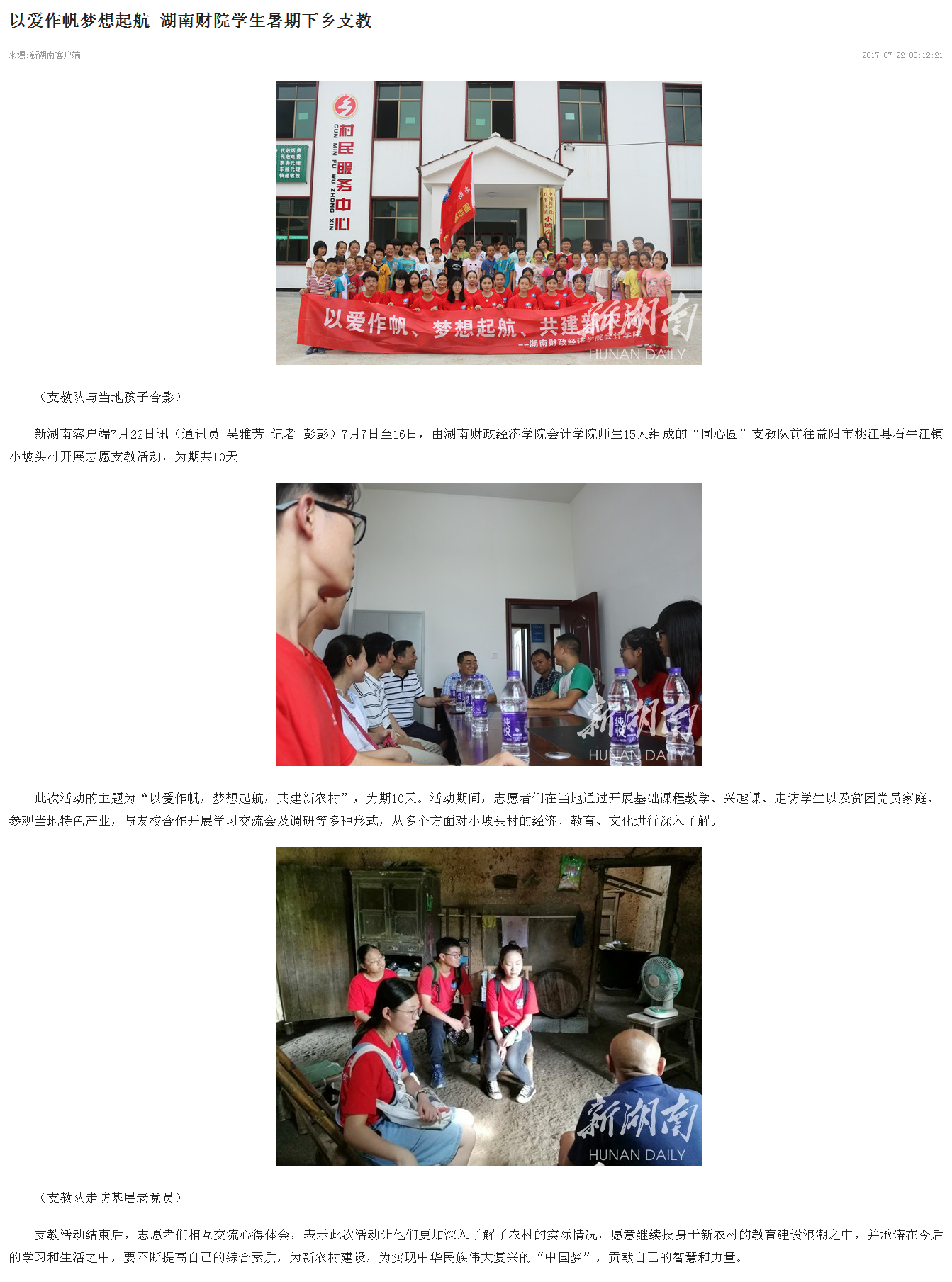 7月19日、22日,红网、新湖南相继对beat365官网学生“三下乡”开展支教活动的相关情况进行了报道。 红网链接:http://gov.rednet.cn/c/2017/07/19/4363991.htm 新湖南链接:http://m.voc.com.cn...