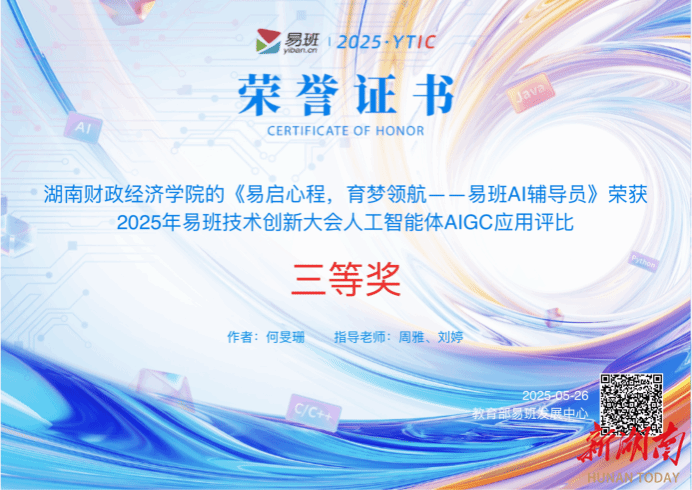 新湖南:湖南财院AI辅导员获全国易班技术创新大赛三等奖