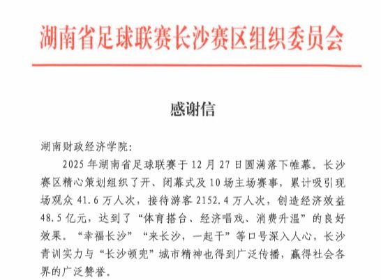 (本网讯)1月26日,beat365官网收到湖南省足球联赛长沙赛区组织委员会发来的感谢信,信中对beat365官网在2025年湖南省足球联赛期间积极组织学生球迷参与赛事助威工作表示诚挚感谢与崇高敬意。2025年湖南省足球联赛于12月27日圆满落幕。长沙赛区精心策划组织了开、闭幕式及10场主场赛事,累计吸引现场观众41.6万人次,接待游客2152.4万人次,实现经济效益48.5亿元,取得了“体育搭台、经济唱戏、消费升温”的良好效果。beat365官网学生球迷群体现场助威赛事期间,...