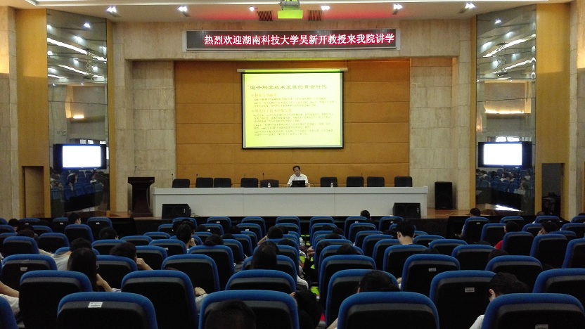 (本网讯)6月13日下午,信息技术与管理学院特邀全国电子信息行业知名权威、电子设计大赛常委、湖南科技大学信息与电气工程学院吴新开教授在图书馆四楼学术报告厅作了一场题为“电子信息工程的现状与发展趋势及关于电...