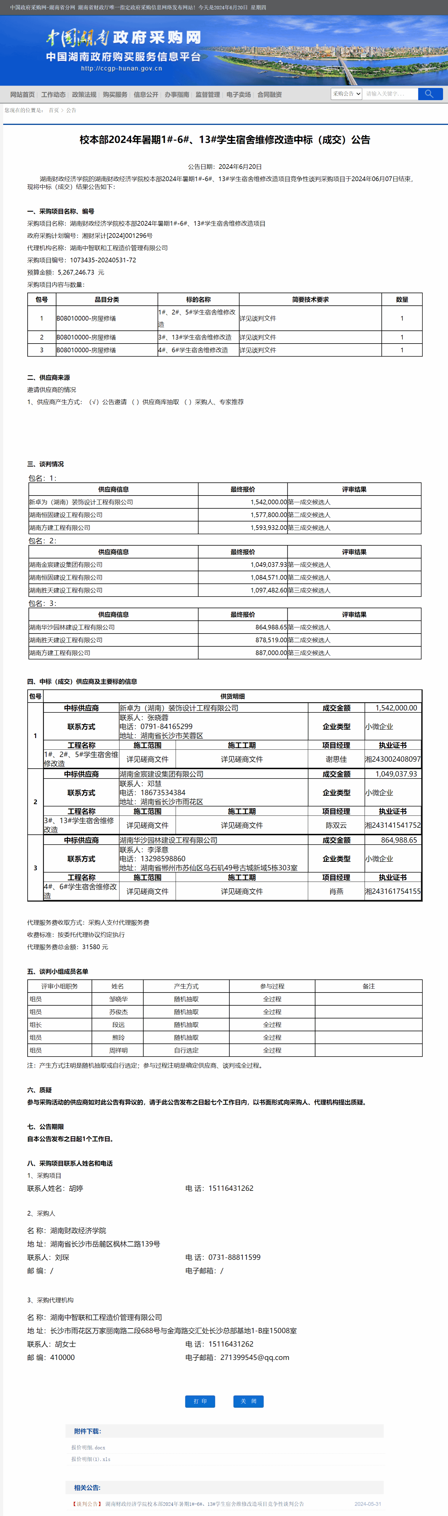 湖南省政府采购网:校本部2024年暑期1#-6#、13#学生宿舍维修改造中标(成交)公告