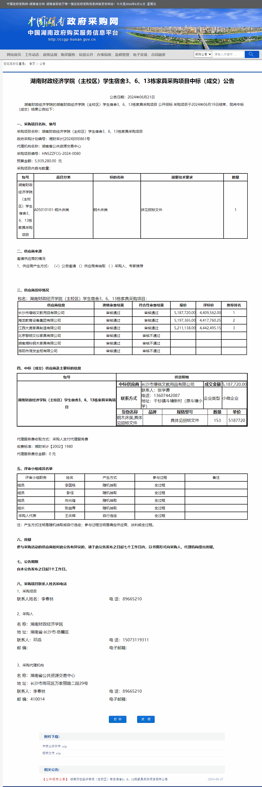 湖南省政府采购网:beat365中文在线官网(主校区)学生宿舍3、6、13栋家具采购项目中标(成交)公告