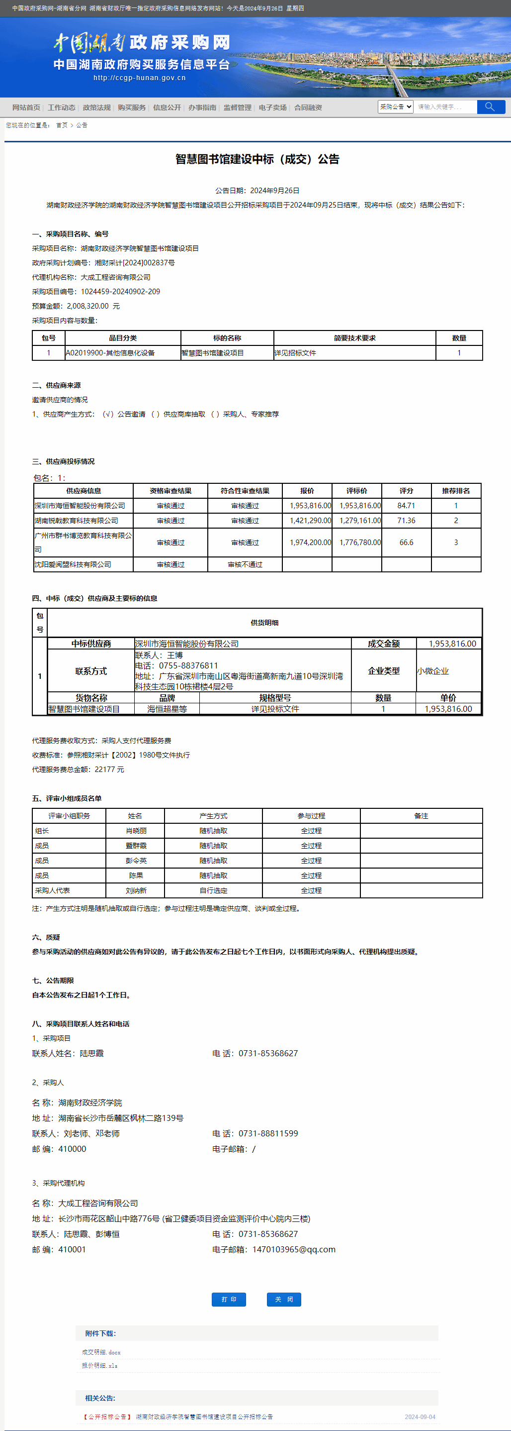 湖南省政府采购网:beat365中文在线官网智慧图书馆建设中标(成交)公告