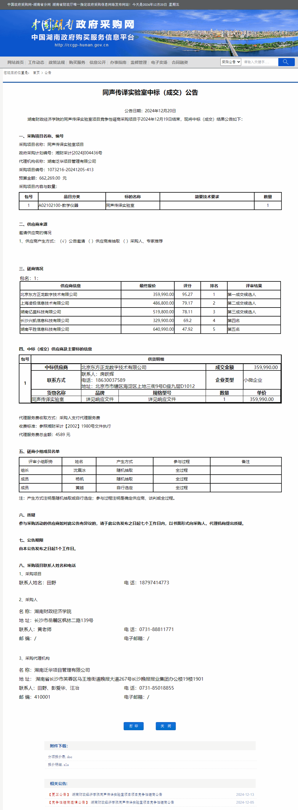 湖南省政府采购网:beat365中文在线官网同声传译实验室中标(成交)公告