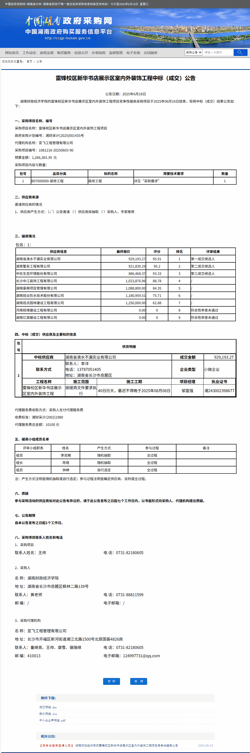 湖南省政府采购网:雷锋校区新华书店展示区室内外装饰工程中标(成交)公告