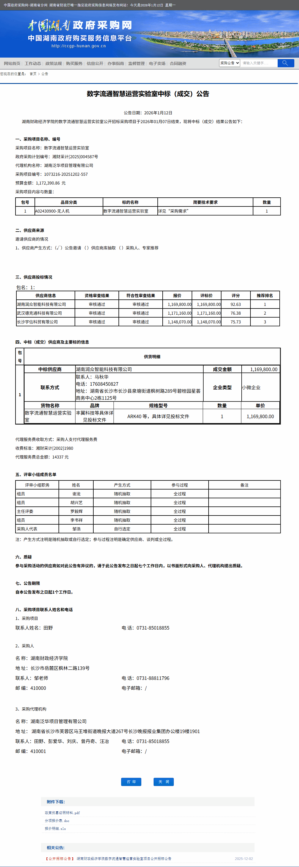 湖南省政府采购网:beat365中文在线官网数字流通智慧运营实验室中标(成交)公告