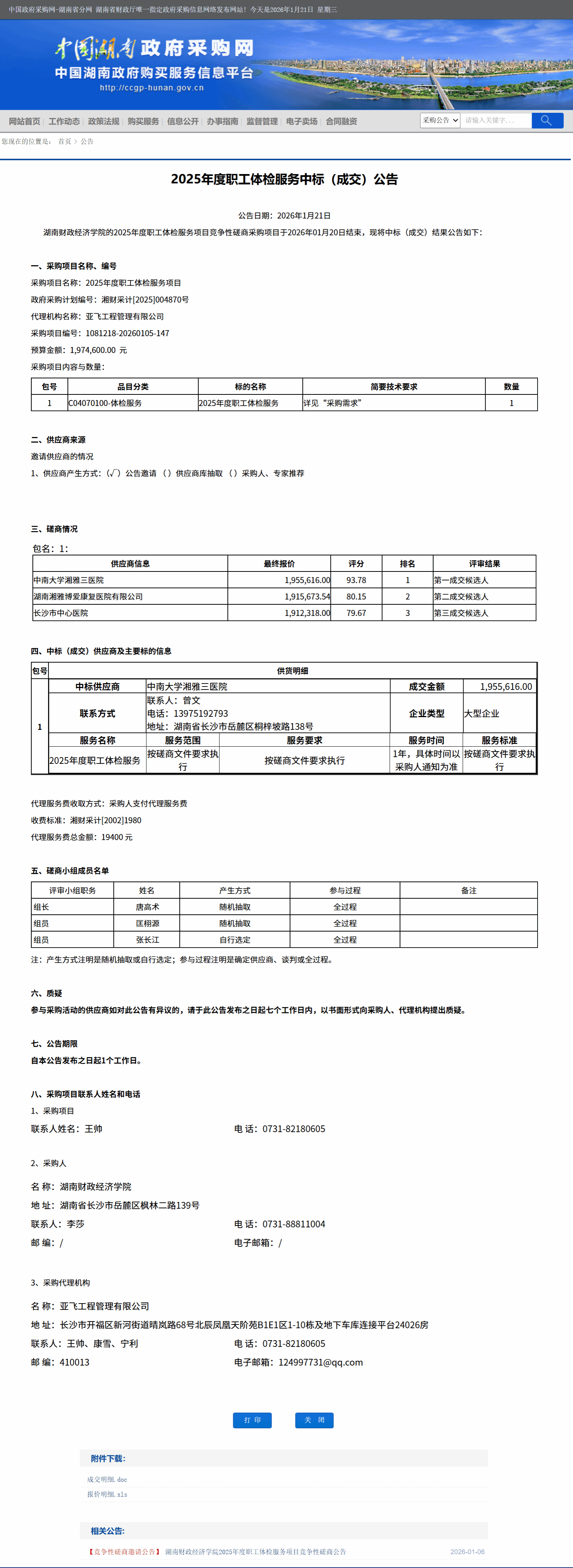 湖南省政府采购网:beat365中文在线官网2025年度职工体检服务中标(成交)公告