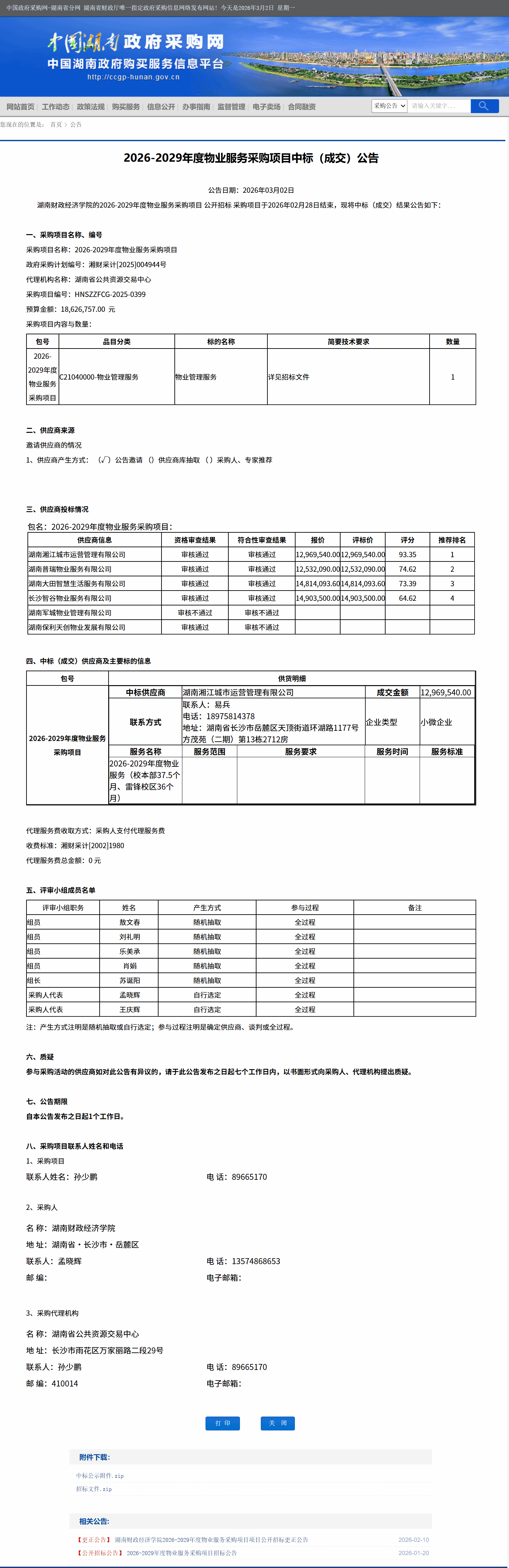 湖南省政府采购网:beat365中文在线官网2026-2029年度物业服务采购项目中标(成交)公告