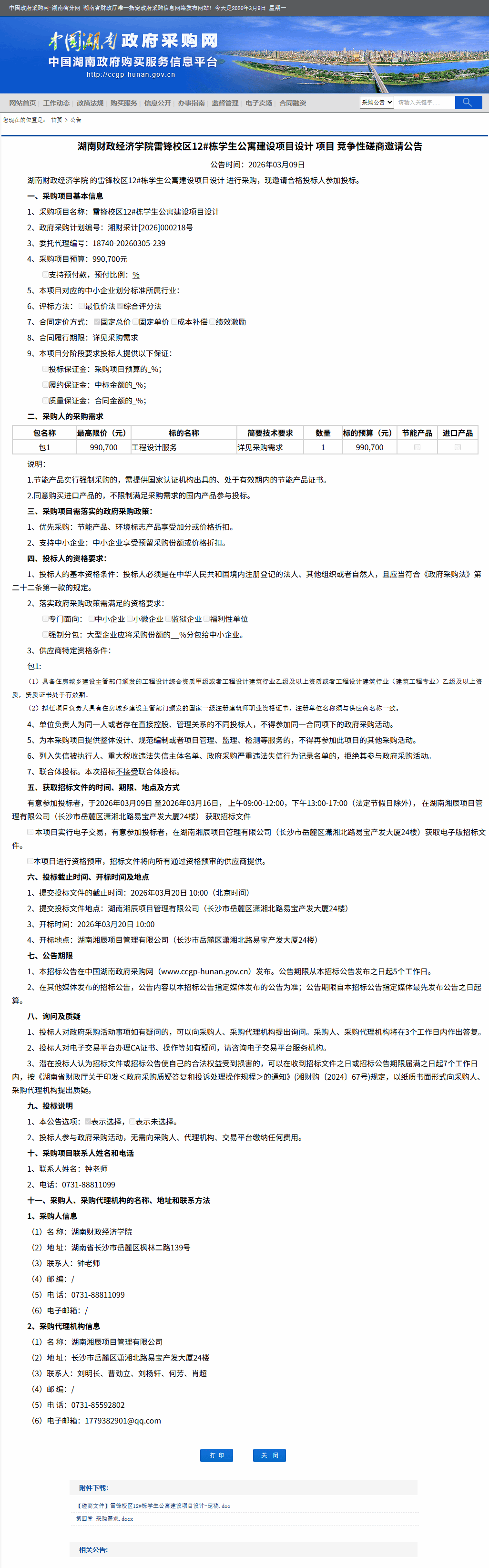 湖南省政府采购网:beat365中文在线官网雷锋校区12#栋学生公寓建设项目设计项目竞争性磋商邀请公告