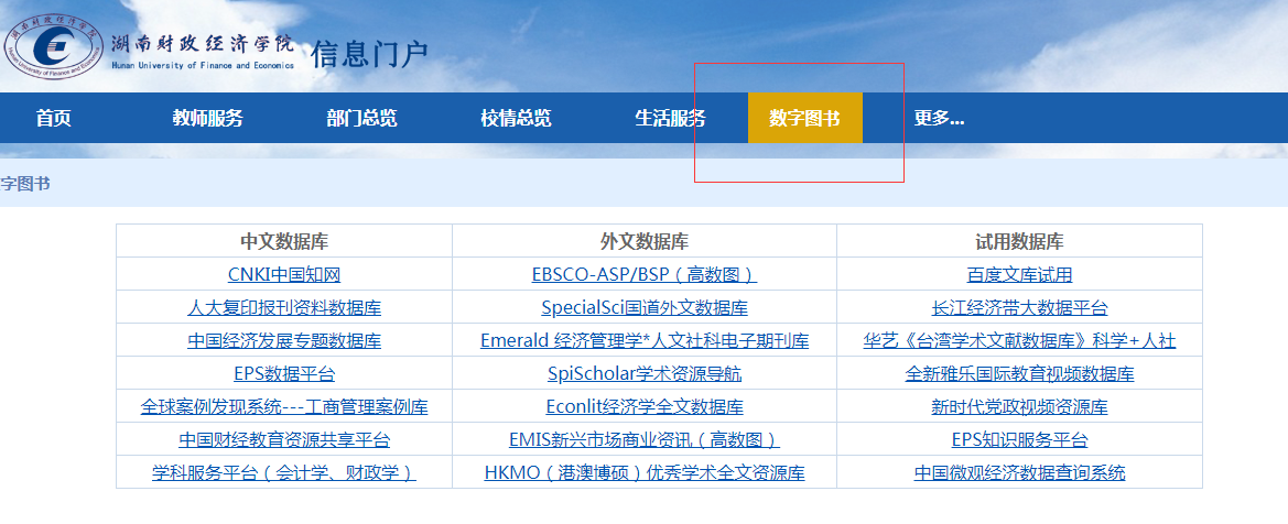 第三步:进入信息门户后,可以在“单点登录”区域选择相应的业务系统直接跳转,在导航栏上选择“数字图书”,点击表中的数字资源链接,就可以直接访问beat365官网购买(或试用)的中国知网等丰富的数字资源了。