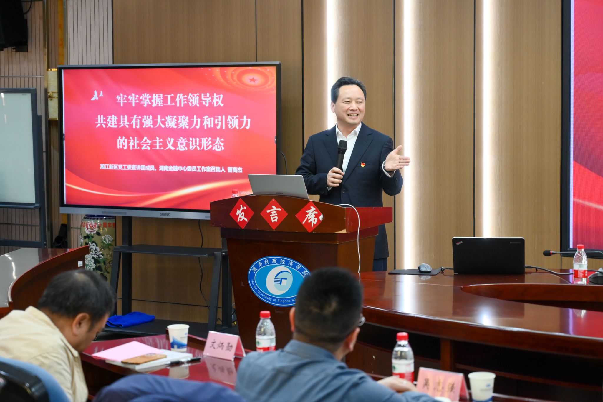 曾高杰围绕“牢牢掌握意识形态工作领导权,共建具有强大凝聚力和引领力的社会主义意识形态”主题,厘清“意识形态”“社会意识形态”“社会主义意识形态”等概念,阐述如何做好意识形态工作的方法,从理论和实践两个维度着重剖析当前意识形态领域面临的风险挑战,强调新形势下做好高校意识形态工作的极端重要性。