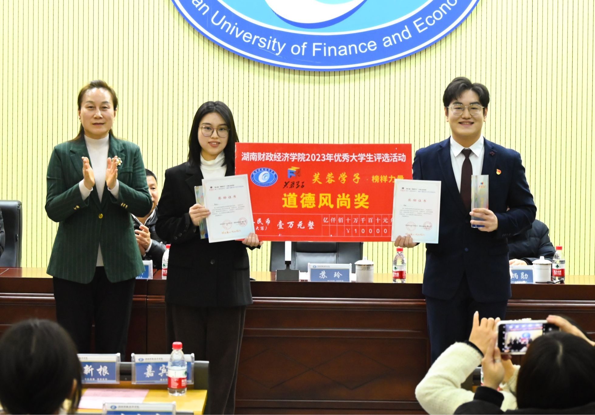 文炳勋宣读了《关于表彰第十八届“芙蓉学子·榜样力量”优秀个人(团队)的决定》。人文与艺术学院赖雨汀和法学与公共管理学院周超荣获芙蓉学子·道德风尚奖,财政金融学院曾依琳和工商管理学院黄关超荣获芙蓉学子·自强不息奖,外国语学院何银和陈宇璐荣获芙蓉学子·公益行动奖,小易志愿服务队和法学与公共管理学院刘清华荣获芙蓉学子·社会实践奖,学术梦之队和亲慕团队荣获芙蓉学子·学术科研奖。