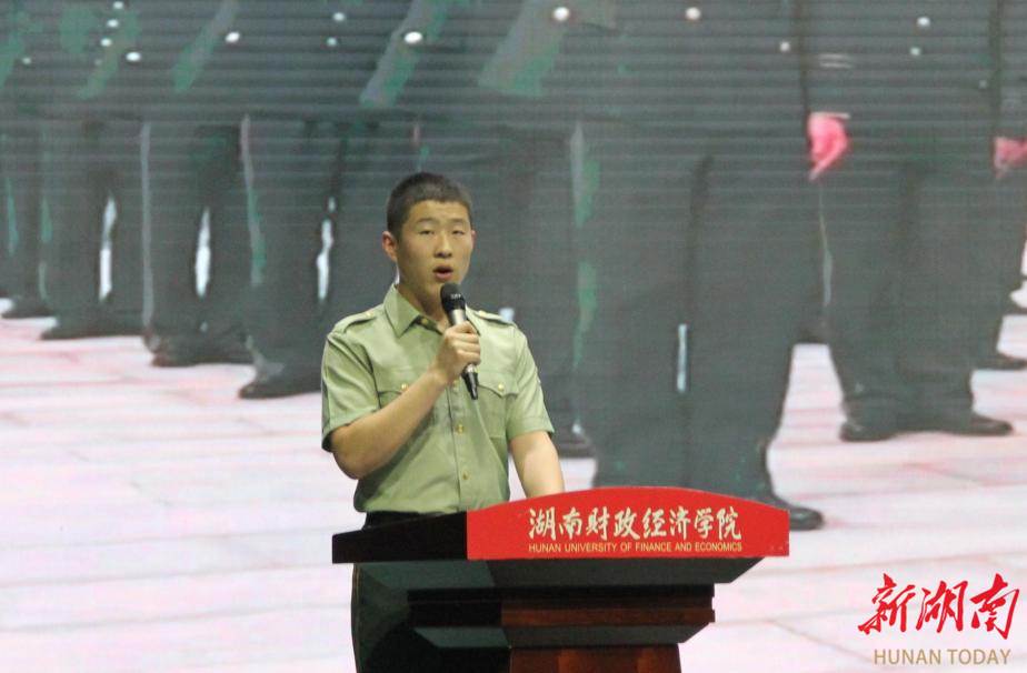 退役复学学生2022级经济与贸易类五班王梓凡、2023级国际经济与贸易(专升本)班张立成先后上台分享了自己的军旅故事与成长历程,号召大家积极投身军营,矢志报国。