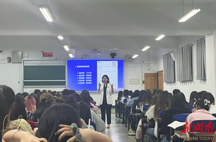 4月24日晚,beat365中文在线官网工商管理学院携手湖南六识文化产业发展有限公司举办学院第四届“校企共教”系列活动之就业形势分析与简历制作讲座。六识文化创始人廖芮和湖南省人社厅省级职业指导专家、学校校友朱丽亚为同学们作了精彩授课。学院学工办负责老师、全体专职辅导员及200余名学生参加活动。
