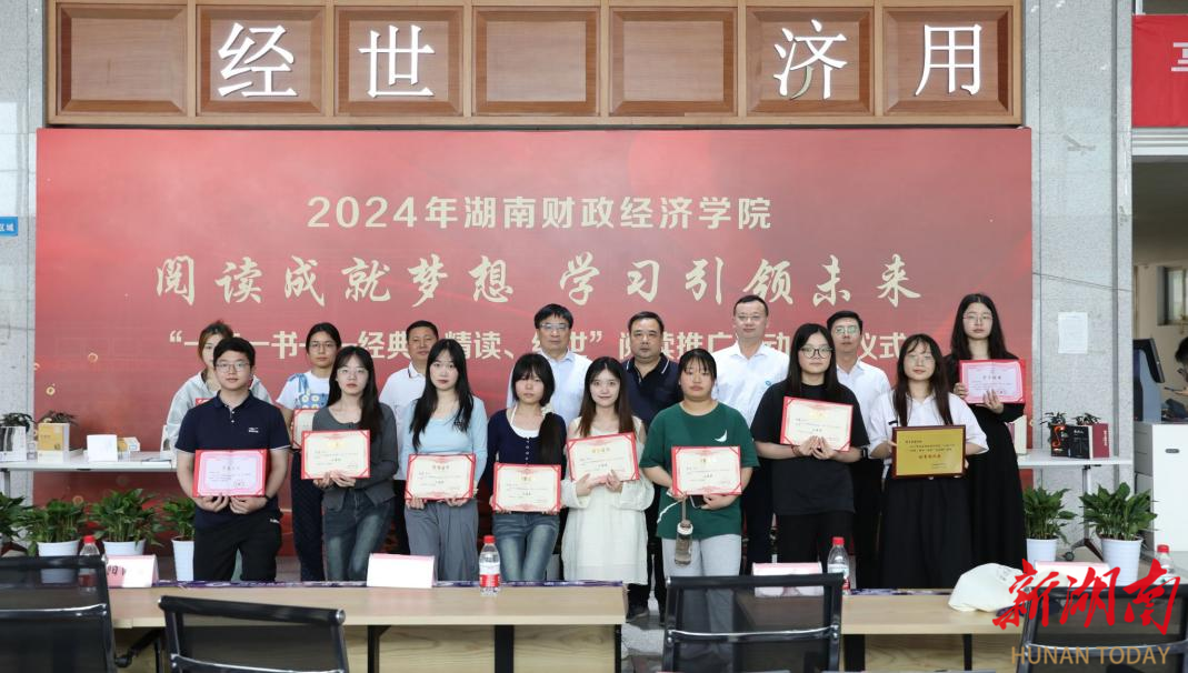 图书馆副馆长饶志英宣读了学校2023年度“一校一书”阅读推广活动获奖名单:钟财龙、黄欣怡同学获得湖南省教育厅“优秀读书报告奖”,周雅老师被评为湖南省高校图书情报工作委员会优秀阅读推广人,学生工作处易班工作站《品红色文化,促长来振兴》获得湖南省高校图书情报工作委员会创新案例奖,会计学院、图书馆读者协会获校级优秀组织奖荣誉称号,朱弥等6名老师同学被评为校级优秀阅读推广人,66名同学获得校级读书报告奖。参会嘉宾为获奖者颁发了荣誉证书。